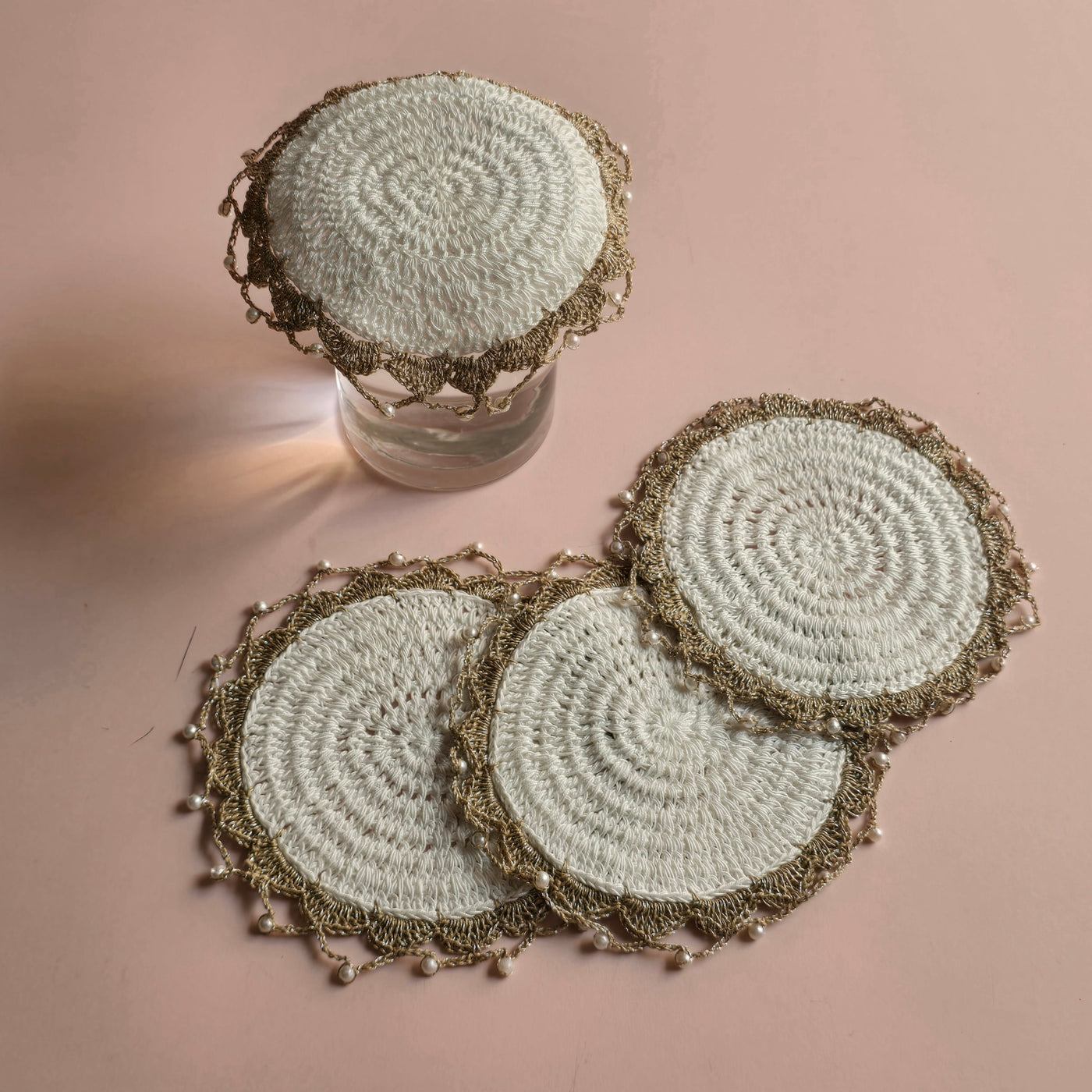 White & Antique Gold Crochet Glass Cover - Set of 6